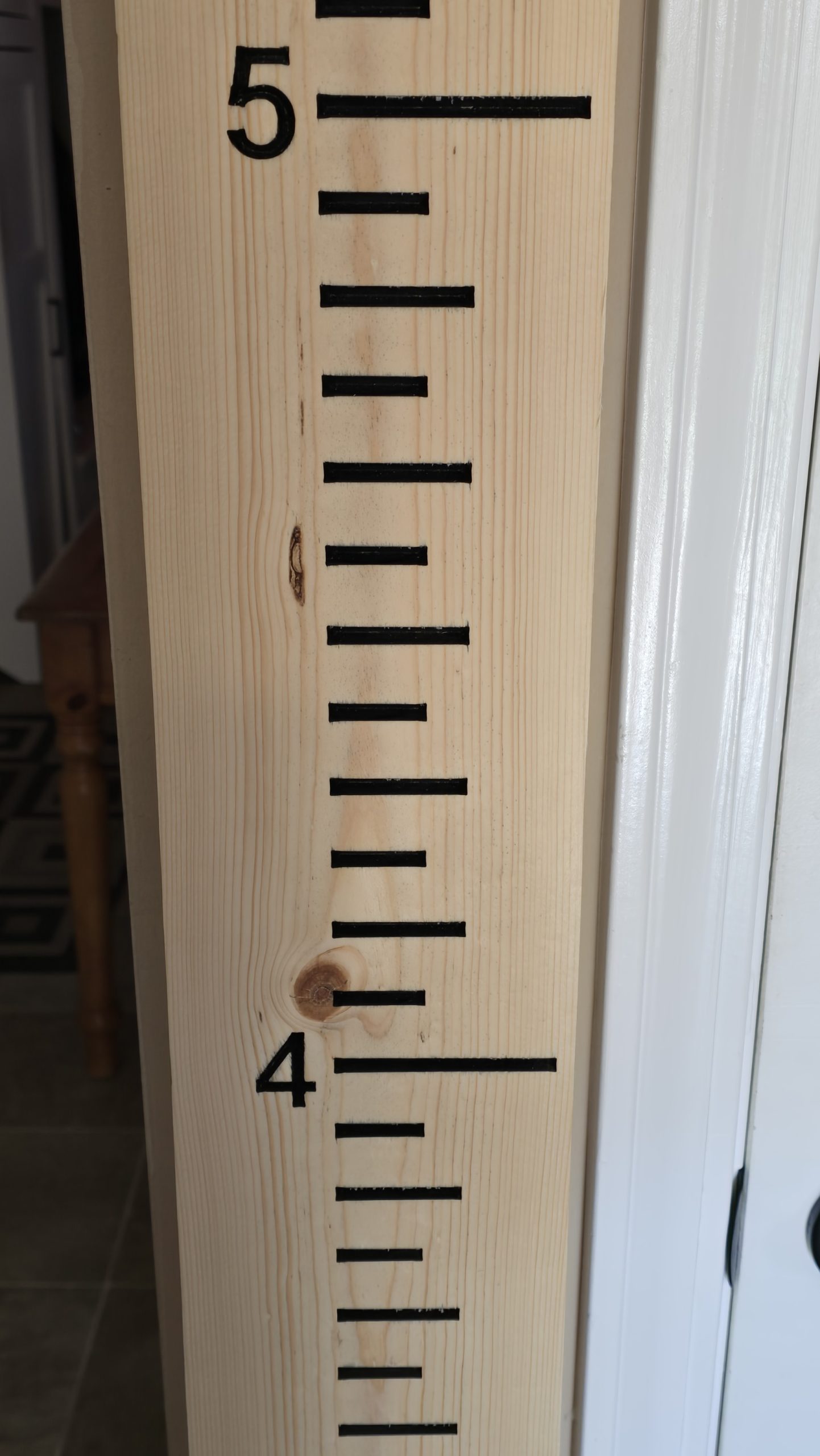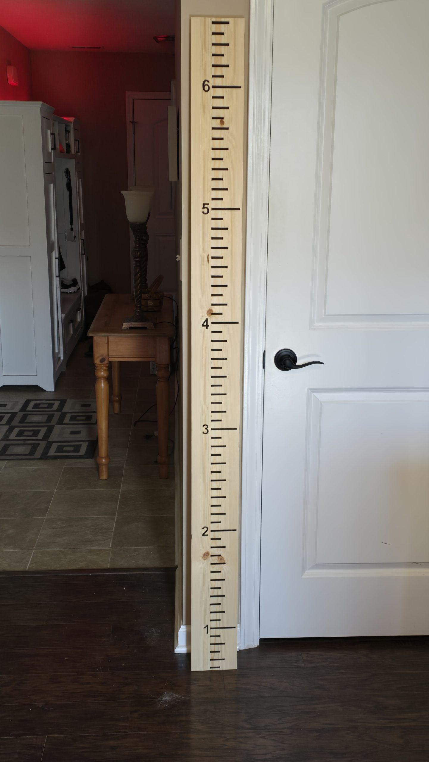New growth chart/height ruler. It’s set for 6 foot 6 inches. The numbers and hash marks are engraved and not cheap vinyl. Each hash mark is approximately 1 inch. It’s designed to be mounted 6 inches off the floor. It’s raw wood but you could stain or paint it but doing this may cause it harder to write on.